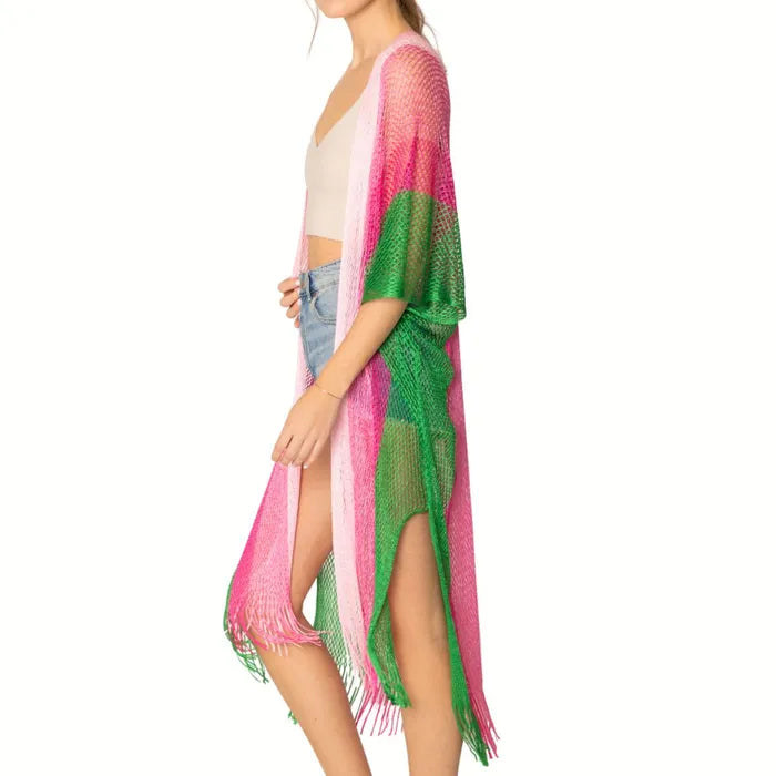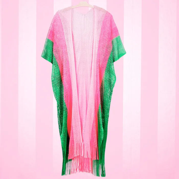 Effortlessly slay your AKA Sorority look with this beautiful and vibrant Pink and Green Kimono. Featuring a trendy Gradient Stripe Knit and a chic Lightweight design, it's the perfect cover-up for any occasion. The bottom fringe edge detailing adds a touch of flair, making it an essential addition to your alpha kappa alpha sorority paraphernalia collection. Wear it proudly at your university, captivate the crowd, and shine like the true Alpha Kappa Alpha woman you are!