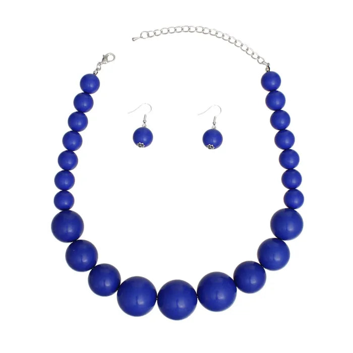 Make way for the queen of bold statements. The Royal Reverie Beaded Necklace Set is serving regal realness in rich matte royal blue. This single strand beauty features graduated acrylic pearls that go from subtly stunning to fabulously oversized-because why settle for subtle when you were born to stand out? Finished with a silver lobster clasp and paired with matching fish hook double pearl drop earrings, this set brings the drama without saying a word.