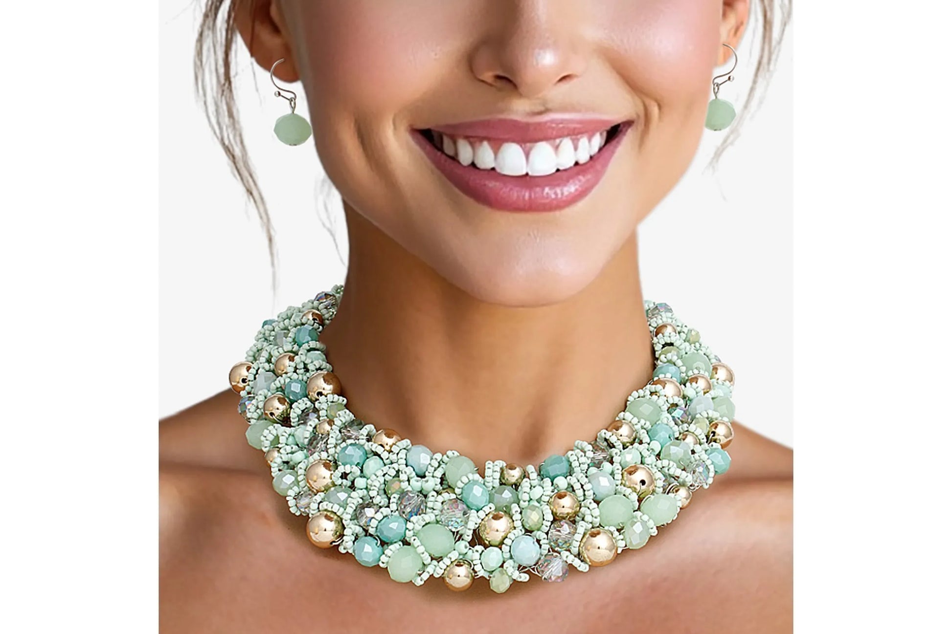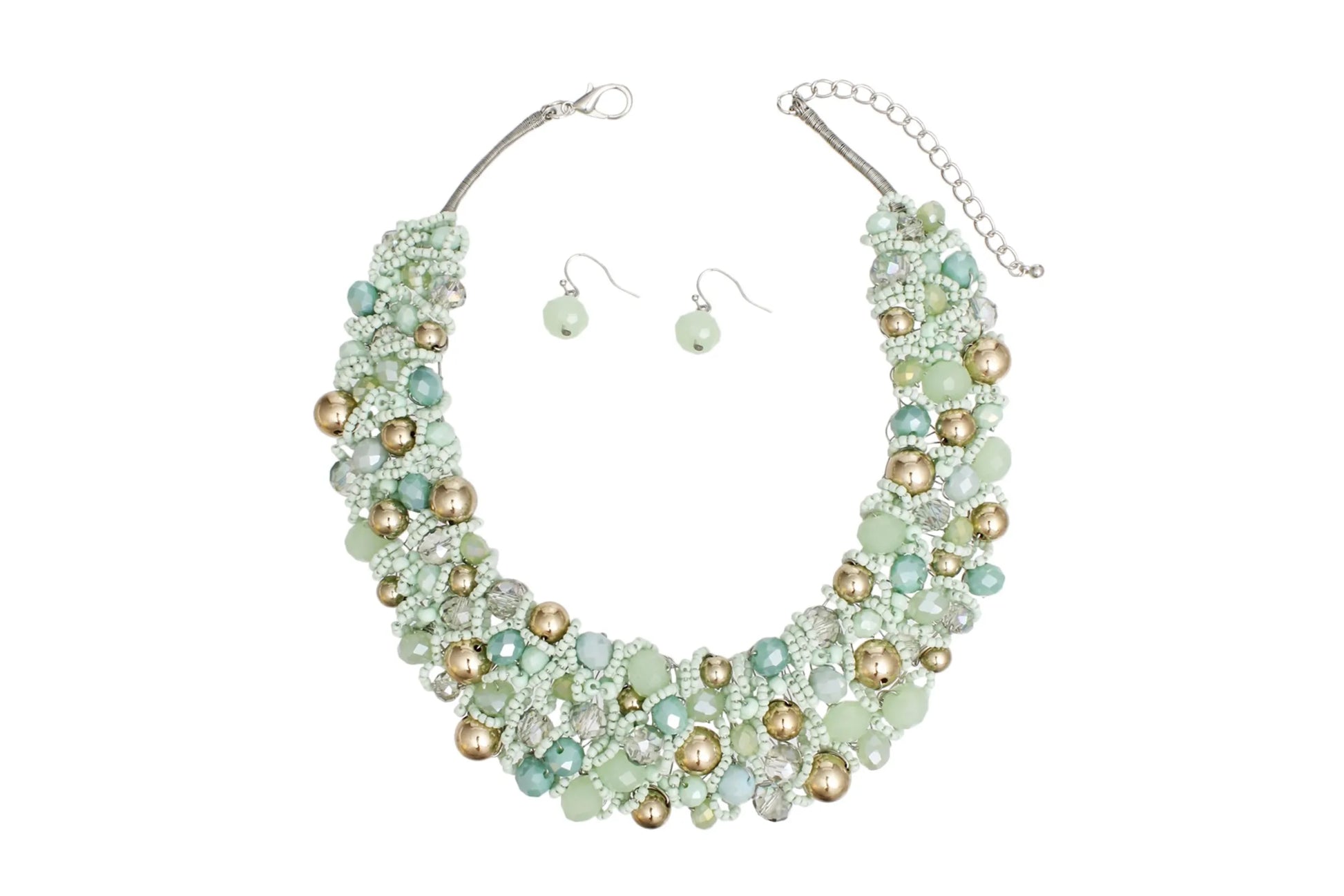 Say hello to the Minted Perfection Bib Choker Set, where sophisticated elegance meets modern chic. This artistic mint green and gold acrylic and glass bead choker necklace is woven with silver-finish copper wire for a design that pops. The graduated bib design brings boldness to your neckline while remaining effortlessly refined. Complete with matching bead fishhook earrings, this set is the perfect accessory for any woman ready to add a splash of color and a touch of edge to her wardrobe.