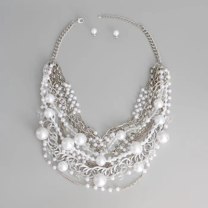 When your outfit demands drama, enter the **Wholesale Chunky Silver Chain White Pearl Layered Necklace** — a bold fusion of modern edge and timeless elegance. This beauty layers chunky silver metal chain links with lush white pearls and faceted acrylic beads, creating a stunning cascade that’s equal parts power move and red-carpet royalty. Whether you’re channeling boardroom boss or cocktail hour diva, this set is here to make sure you shine from every angle. Complete with matching pearl stud earrings for that extra touch of coordination magic.