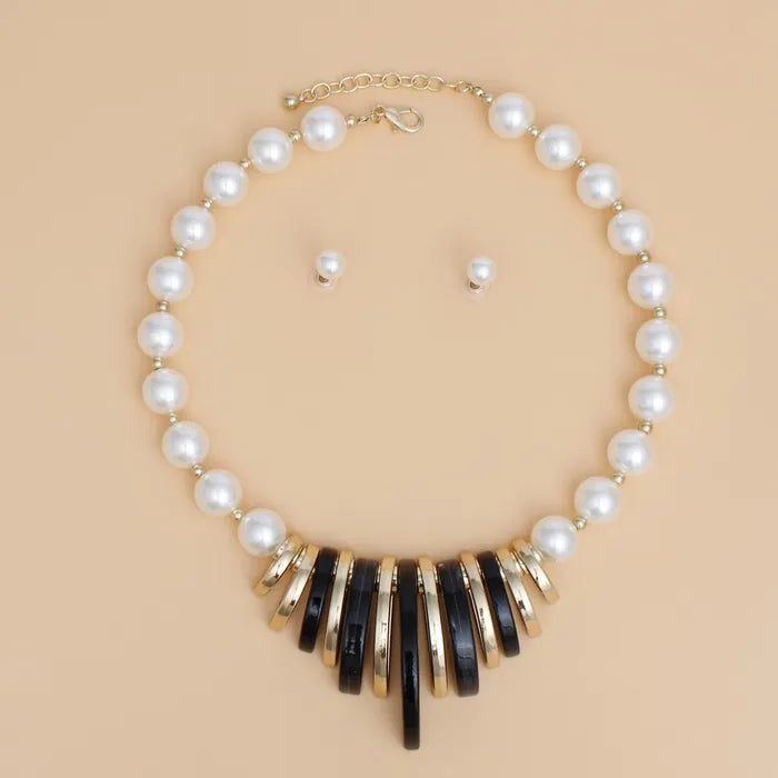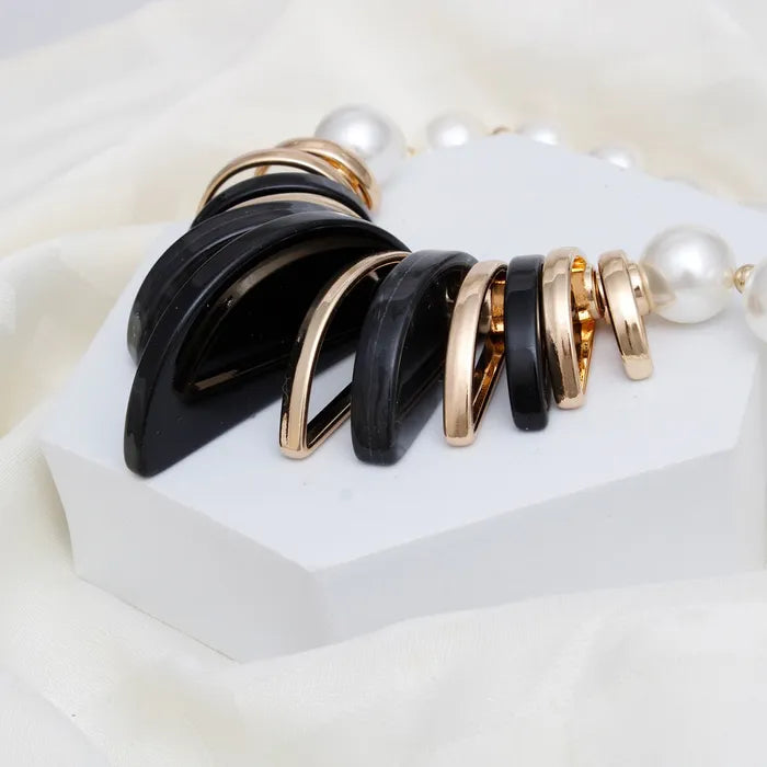 When elegance meets attitude, you get the Bold Grace Black and Gold Pearl Necklace Set-a fearless fashion statement for the boss who leads with style. Cream acrylic pearls strut confidently across your neckline, flanked by gold bead spacers and a sculptural collar of dramatic black resin and gold acrylic semi-circles. It's refined, it's fierce, and it comes with matching pearl ball stud earrings to complete the takeover. Whether you're commanding a boardroom or lighting up a gala, this set delivers unapologetic grace with a bold twist.