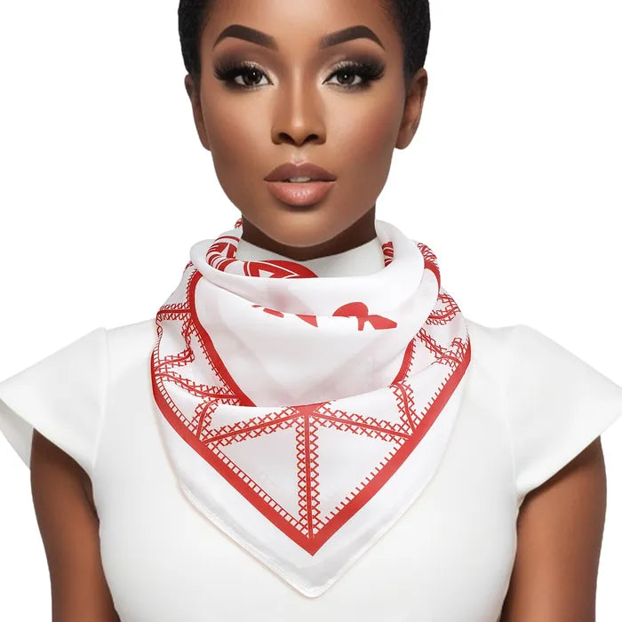 Unleash your inner strength and style with the *Delta Sigma Theta Sorority Lady Fortitude White Square Scarf*. This luxurious, large white scarf features a bold red DST shield and a powerful Lady Fortitude design, complemented by sharp zigzag stripe edging. Crafted from 100% silky polyester, this scarf offers the perfect mix of sophistication and sorority pride. Whether draped around your neck or styled creatively, it's a must-have accessory for every Delta woman who commands attention.