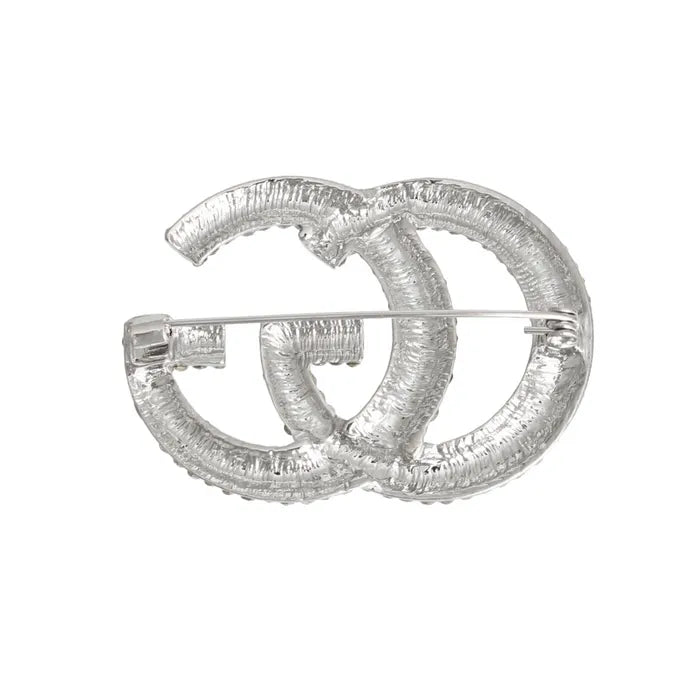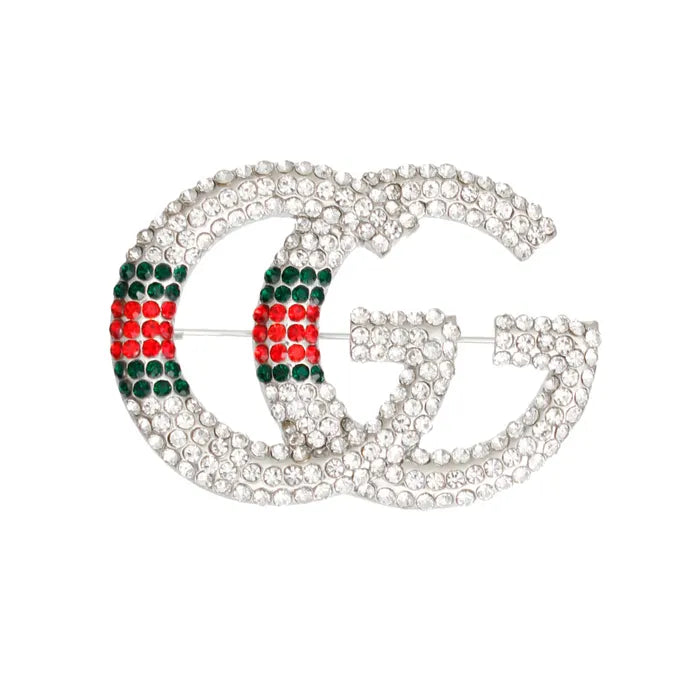 Silver Metal and Clear Rhinestone GG Brooch Pin Featuring Red and Green Designer Inspired Stripe Detail. Pin Closure.