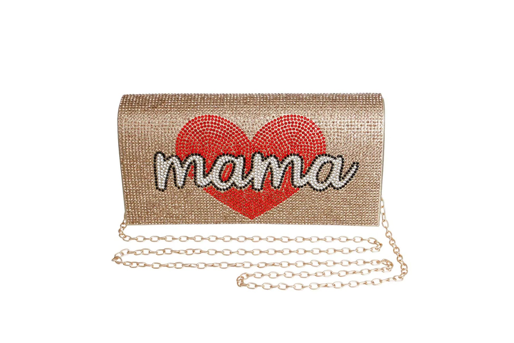 Shiny Gold Vegan Leather and Gold Rhinestone Clutch Handbag Featuring Heart and Mama Detail. Flap and Snap Closure. Detachable Shoulder Chain Included.
