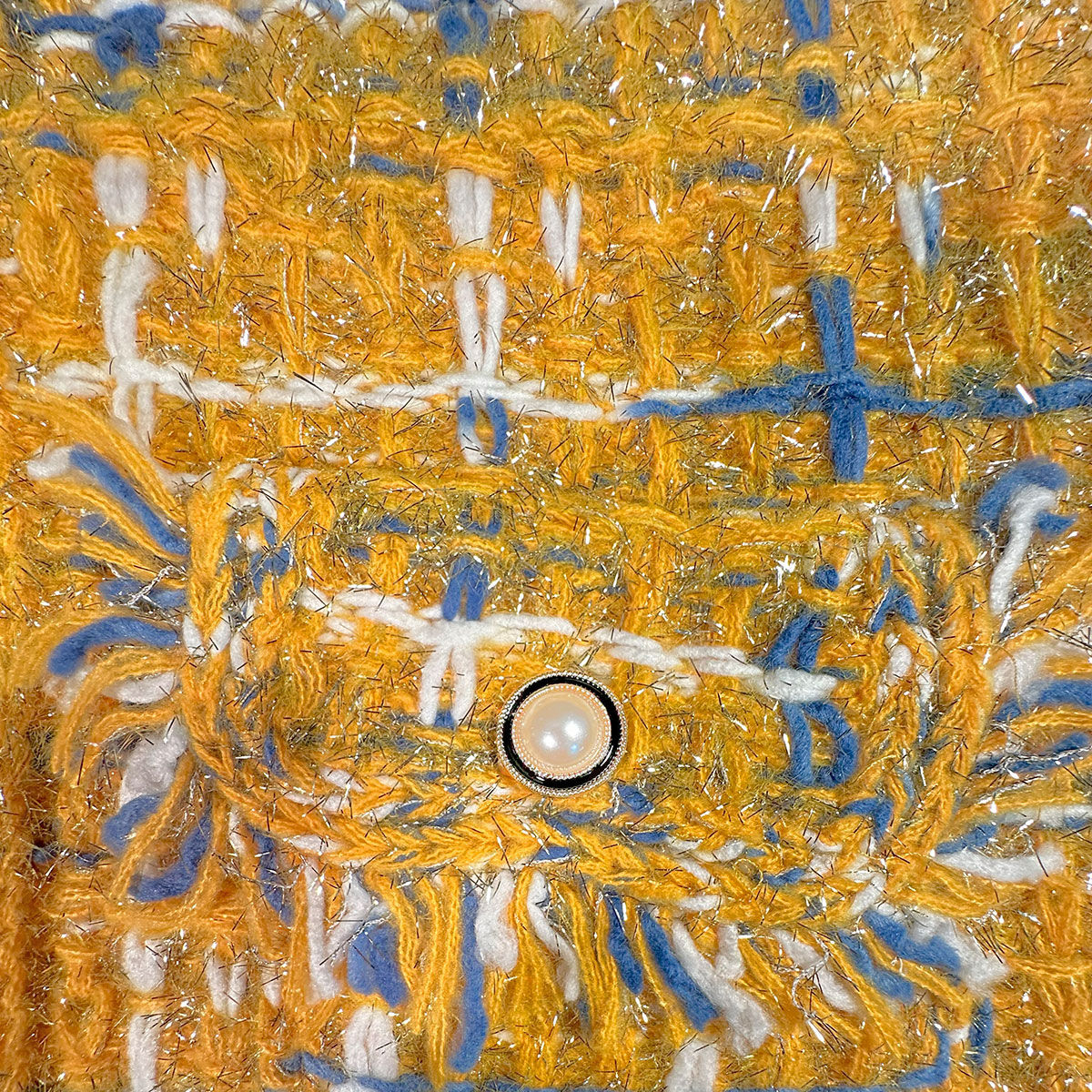 Women's Plaid Tweed Vest with Mustard Yellow, Blue, White, and Metallic Soft Knit Woven Fabric. Vest Features Fringe Edging and Pearl Front Flap Pockets. One Size. 100% Acrylic.24 inches long, 22 folded with.