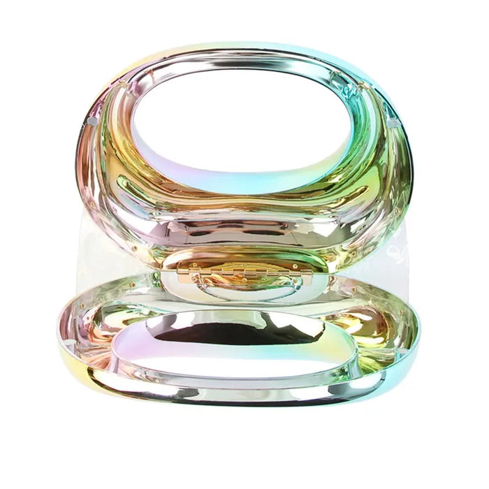 Step into the spotlight with this show-stopping crescent moon-shaped handbag, where elegance meets otherworldly glamour. Crafted from high-quality multicolor acrylic with a mirror finish, this handbag is the perfect accessory for adding a touch of cosmic beauty to any evening look. The top handle and sleek clear plastic sides ensure you're making a statement while staying effortlessly chic, while the detachable gold metal shoulder chain gives you options for hands-free glam. Magnetic hinge closure for easy access-because, darling, you deserve convenience with style.