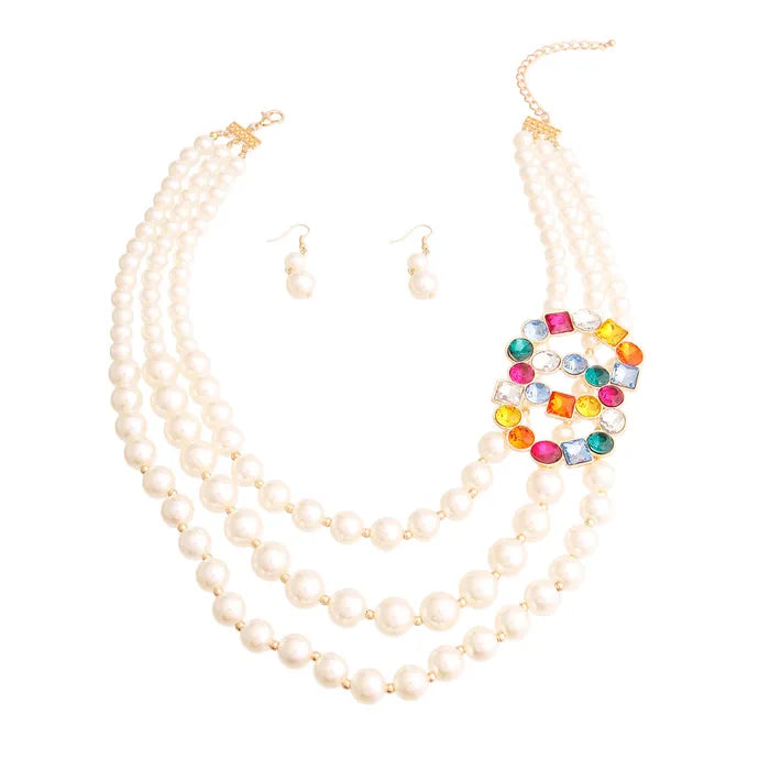 How to Style: Formal Elegance: Elevate your formal attire by letting this necklace set be the centerpiece of your ensemble, creating an air of opulence and grace. Special Occasions: Perfect for special events, this necklace set adds a touch of sophistication and color to your overall look. Statement Piece: Wear it with a simple dress to let the intricate detailing and vibrant crystals stand out as a bold and eye-catching statement. Product Details: Category: Fashion Accessories Sub Category: Necklace Set Material: Gold Metal, Cream Pearls, Multi-Color Crystal Rhinestones Detail Dimensions: 3.15 inches long, 2.25 inches wide Length: Layers range from 22 inches to 30 inches With the Gold Metal and 3 Strand Graduated Cream Pearl Layered Necklace Set, you're not just accessorizing; you're making a statement of refined style. Let the combination of cream pearls, designer-inspired multi-color crystals, and adjustable layers express your unique fashion sense. Embrace the versatility of this necklace set, effortlessly transitioning from formal events to special occasions. Make every moment special with this timeless and captivating accessory!
