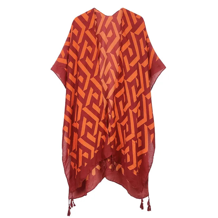 Turn heads like a sun goddess on a mission in this Geo Print Orange and Rust Kimono. With its earthy orange and rust geometric pattern, lightweight feel, and sassy tassel details, this one-size wonder drapes like a dream and makes you look effortlessly fierce. The rust-hued edges add a rich contrast, while the subtle swing of bottom tassels says, "I came to slay, not sway." Made from breezy 100% polyester, it's your new go-to for layering drama, warmth, or just sheer fabulousness.