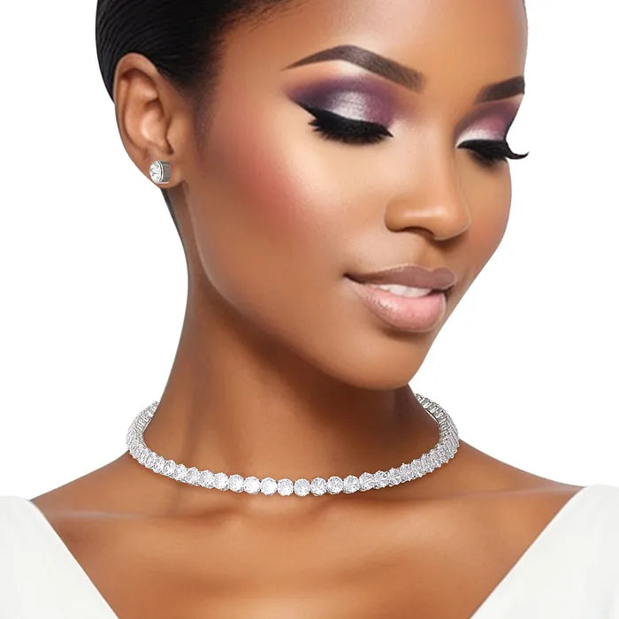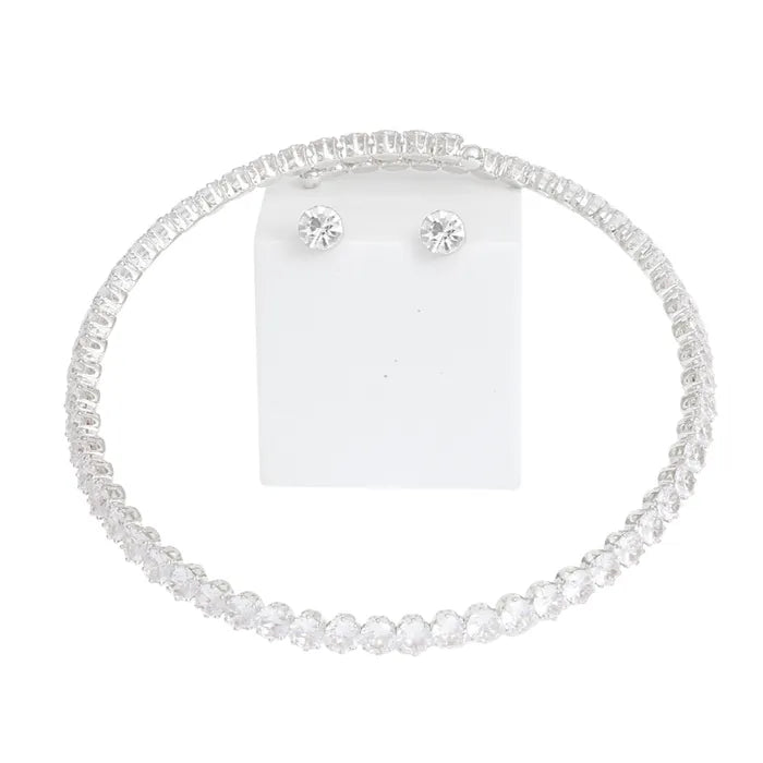 Step into the spotlight with the Celestial Queen Silver Rhinestone Choker-an exquisite statement piece designed to dazzle. Crafted from gleaming silver metal, this memory wire wrap choker contours gracefully around your neck for a custom fit, no clasp needed. A single row of twinkling clear rhinestones catches the light with every move, ensuring you radiate pure brilliance. And because a queen should never sparkle alone, this set includes matching rhinestone stud earrings for that extra touch of glam.