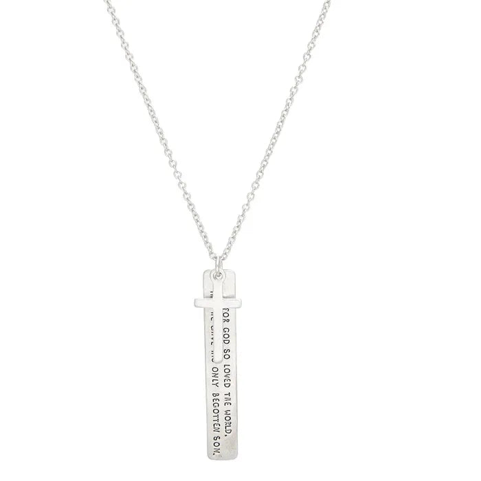 Embrace faith and elegance with the Wholesale Necklace Burnished Silver Bible Verse Cross for Women. This long, dainty chain necklace, crafted from burnished silver metal, features an inspiring Bible verse engraved on a delicate plate pendant, paired with a charming cross pendant. The plate pendant measures 2.15" x .35" and is secured with a lobster clasp closure, making it a perfect blend of spirituality and style.