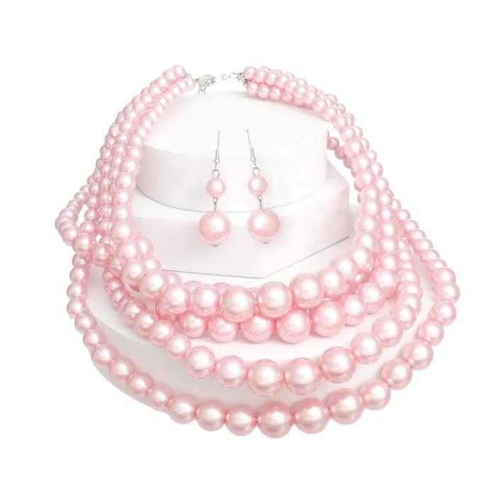 Step into a world of timeless glamour with the Blush Royale 5-Strand Pearl Necklace Set. Featuring cascading layers of luscious pink acrylic pearls, this graduated design oozes vintage sophistication with a modern, feminine twist. Secured with a silver metal lobster clasp, this statement piece ensures you're always draped in elegance. And because no queen should go without her crown jewels, this set includes matching fish hook double pearl drop earrings to complete the look. Whether you're ruling the boardroom or dazzling at brunch, this pink pearl set is here to make a statement-bold, classy, and unapologetically fabulous.