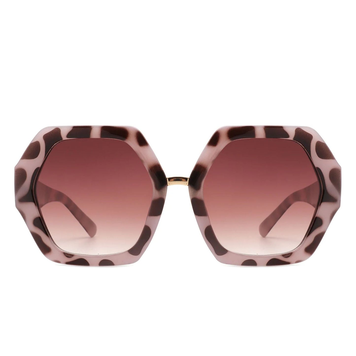 Women's Geometric Oversized Sunglasses. Hexagonal Geometric Leopard Print Plastic Frame Oversized Sunglasses Featuring Gold Cut Out V Side Arm Detail and Gold Nose Bridge. Gradient Tint Color PC Lens. UV 400. 100% UVA & UVB Protection. Lens Width: 54mm. Lens Height: 53mm. Bridge Width: 22mm. Temple Length: 138mm.