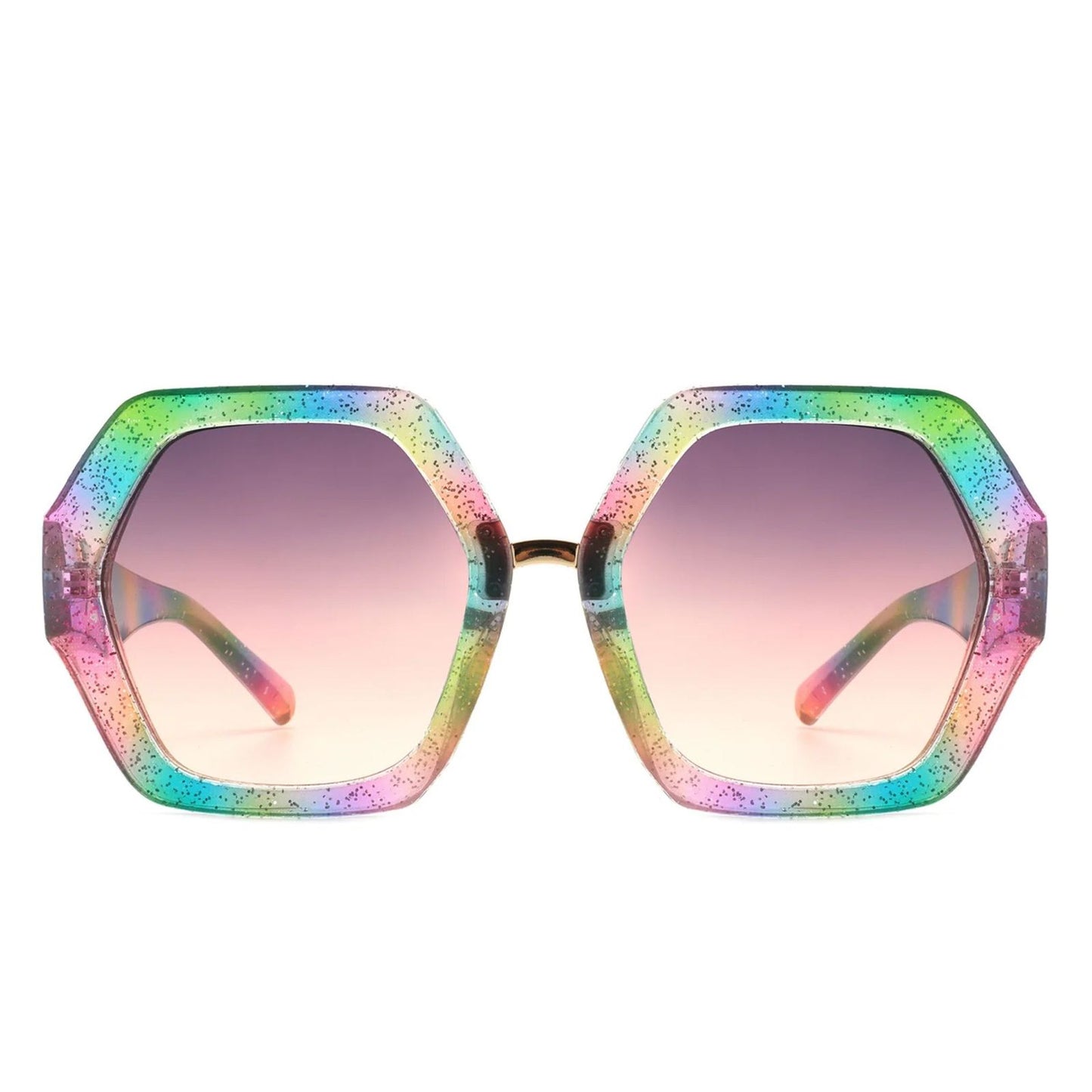 Women's Geometric Oversized Sunglasses. Hexagonal Geometric Rainbow Glitter Plastic Frame Oversized Sunglasses Featuring Gold Cut Out V Side Arm Detail and Gold Nose Bridge. Gradient Tint Color PC Lens. UV 400. 100% UVA & UVB Protection. Lens Width: 54mm. Lens Height: 53mm. Bridge Width: 22mm. Temple Length: 138mm.